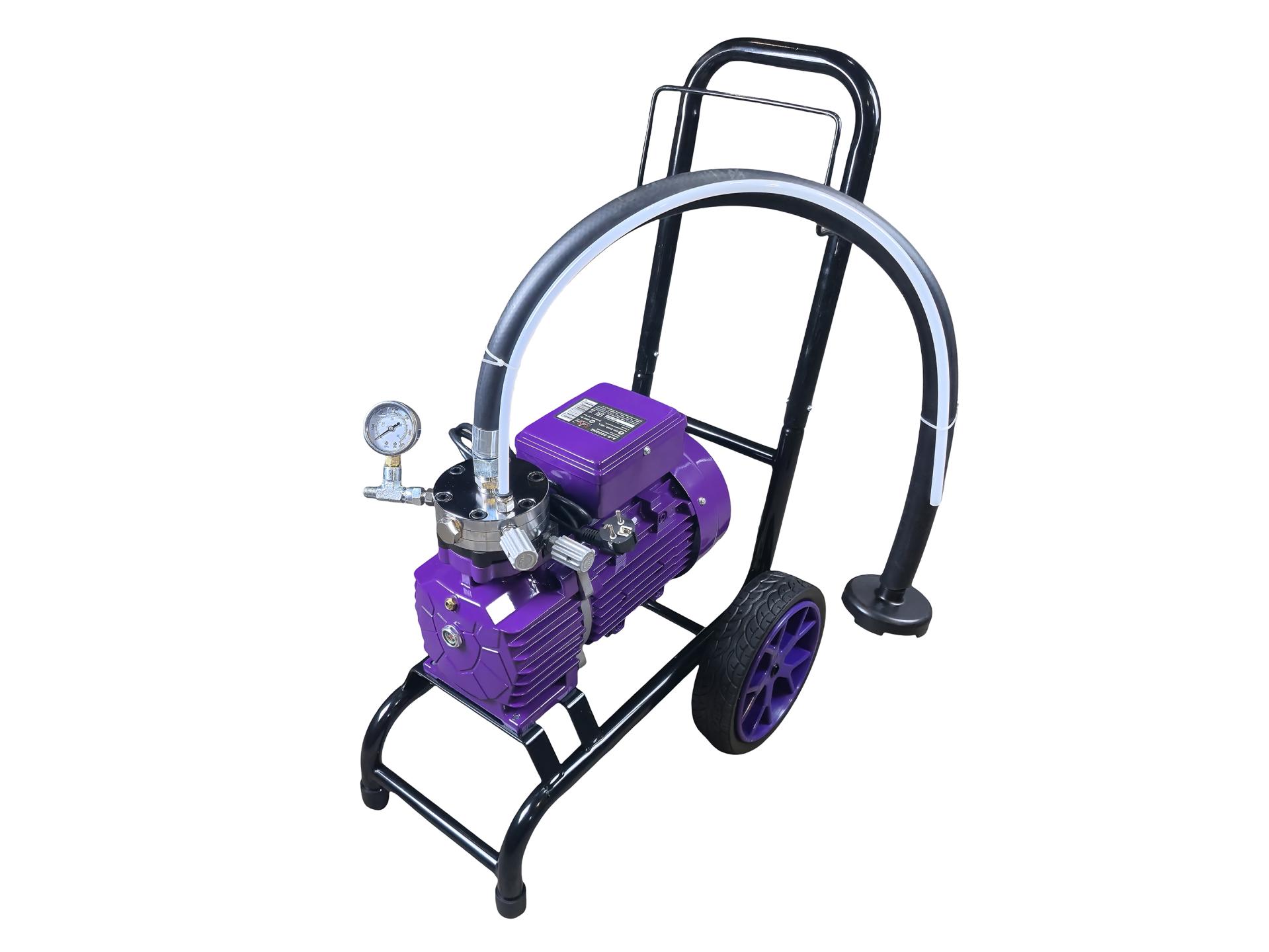 Под действием электрического мембранного насоса лакокрасочное покрытие подается через шланг на распылитель для краски. Преимущество безвоздушного электрического окрасочного аппарата: низкая цена, мобильность и легкость аппарата, простота конструкции и легкость в обслуживании.
